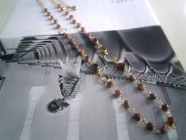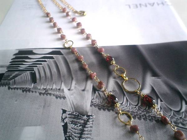 ジャンヌの幸せ・・シリーズです♪お気に入りのピンクと赤・・シックなロードナイトのネックレスです♪深い赤のガーネットを合わせて大人のロマンチックしています♪ロードナイトは6ミリ位のミニ・タンブル、ガーネットは10×8ミリ位のオーバルです♪長さは全長80センチ位で調節自由です♪ブレスレットにされても素敵です♪同じデザインの長さ違いのネックレスやブレスレットも出品しています♪シンプルで合わせやすいデザインを考えて作りました♪♪ハンドメイドをご理解頂いてノークレーム、ノーリターンでお願いします