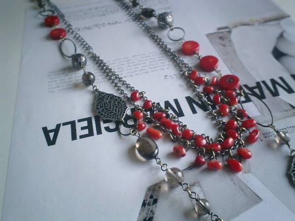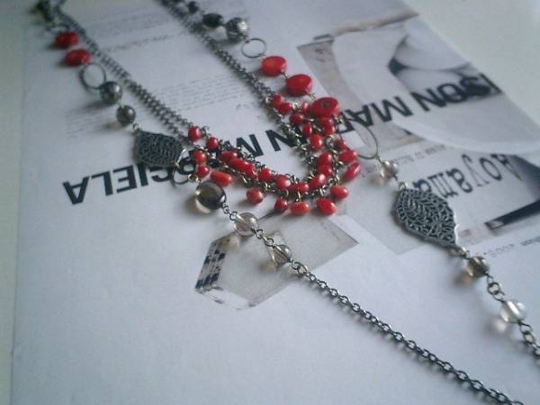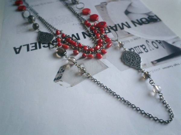 ロマンチック・セレクト・・シリーズです♪カプチーノ気分・・シックな深い赤の珊瑚のネックレス2本セットです♪スモーキークォーツや木の葉のチャームを合わせてニューヨークモダンしています♪短い方のネックレスは珊瑚のさざれを2連に繋いで可憐な表情です♪長さは全長65センチ位で調節自由です♪チョーカー風にされても素敵です♪長い方のネックレスは12ミリ位のコインの珊瑚にスモーキークォーツの丸玉やオーバル、透かしチャームや木の葉のチャームを合わせました♪長さは全長102センチ位で調節自由です♪2連にされても素敵です♪それぞれ単品やブレスレットも出品しています♪シンプルで飽きのこないいつまでも着けられるデザインを考えて作りました!ハンドメイドをご理解頂いてノークレーム、ノーリターンでお願いします