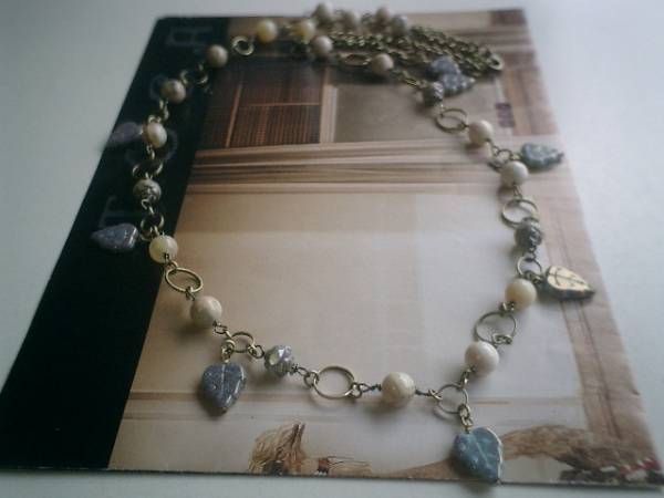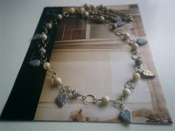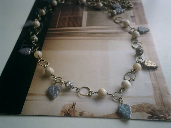 ロマンチック・パターンシリーズです♪グリム童話の葉っぱ・・アフリカンオパールとチェコの葉っぱのネックレスです♪ナチュラルホワイトのアフリカンオパールとブルーグレーの葉っぱが大人のロマンチックしています♪アフリカンオパールは8ミリの丸玉、チェコの葉っぱは12ミリ位です♪長さは全長84センチ位で調節自由です♪2連にされても可愛いです♪お揃いのブレスレットやピアスも出品しています♪♪シンプルでいつまでも着けられるデザインを考えて作りました!ハンドメイドをご理解頂いてノークレーム、ノーリターンでお願いします
