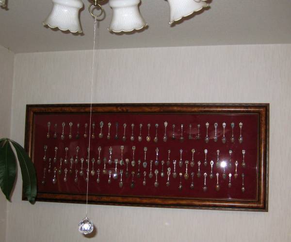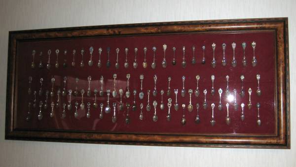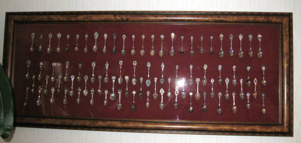 海外78都市のシンボルマークの付いた78本のスーベニア・スプーンと特別誂えのコレクション・ラック。これらのスプーンは、世界各都市に行かなければ入手できません。 今上天皇が、英国へ留学されていた当時に蒐集されていたことで有名です。また、古くから国際線のパイロットや外国航路の船長たちもコレクションしています。銀メッキのスプーンは、当然ながら時の経過で黒ずんでいますが、それが古色蒼然とした味わいです。