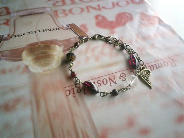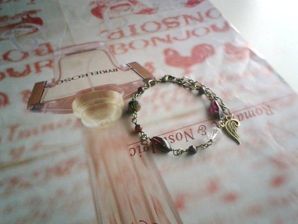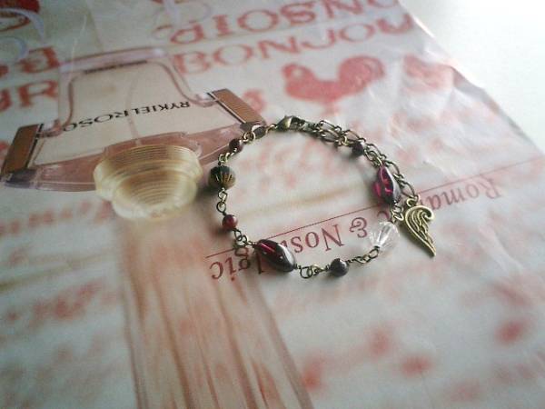 やさしい時間・・シリーズです♪ガーネットと天使・・深い赤のガーネットのブレスレットです♪チェコビーズや天使の羽根を合わせてロマンチックな表情です♪ガーネットは5ミリの丸玉、7×12ミリ位のラフ・タンブルです♪長さは全長23センチ位で調節自由です♪お揃いのネックレスも出品しています♪シンプルで飽きのこないいつまでも着けられるデザインを考えて作りました!ハンドメイドをご理解頂いてノークレーム、ノーリターンでお願いします