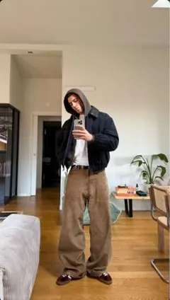 Carhartt Dungaree Fit ペインターパンツ を使っております。生地感は良く、形などが定まりやすいパンツになります。着画もありますのでご参考にください。